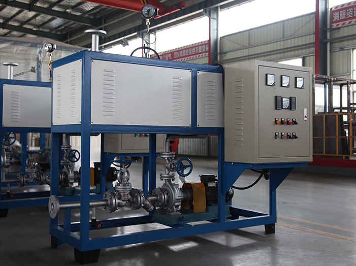 導熱油爐(又稱導熱油加熱器)是將是將電加熱器直接插入有機載體(導熱油)中直接加熱,利用循環泵,強制導熱油進行液相循環,將熱量傳遞給用一個或多種用熱設備,經用熱設備卸載后,重新通過循環泵,回到加熱器,再吸收熱量,傳遞給用熱設備,如此周而復始,實現熱量的連續傳遞,使被加熱物體溫度升高,達到加熱的工藝要求。