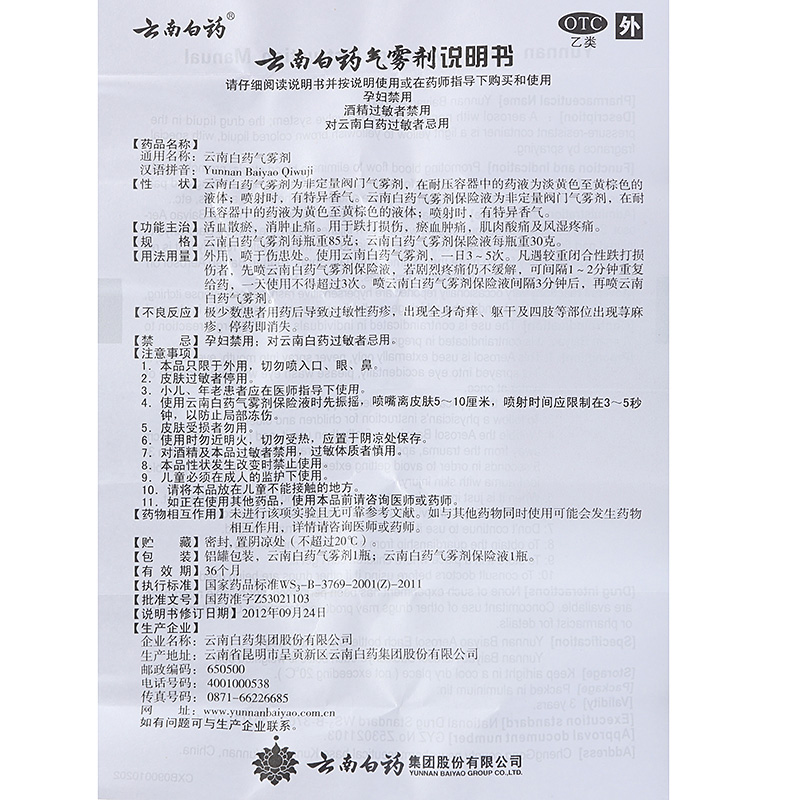 藥品通用名:云南白藥氣霧劑藥品名稱:云南白藥氣霧劑有效期:36個月